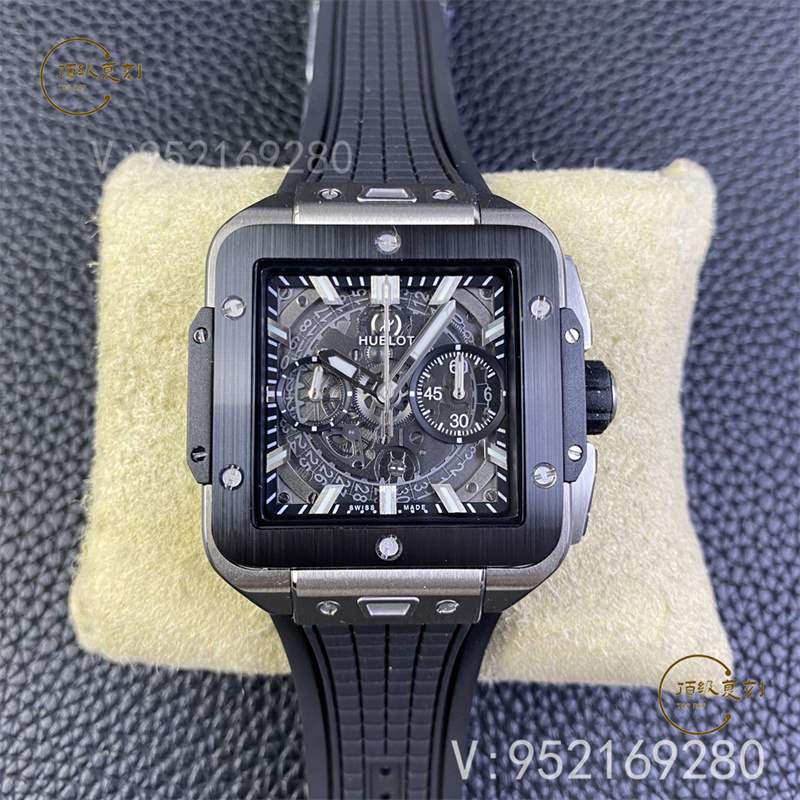 全新核心作品 HB SQUARE BANG UNICO系列,宇舶方形五級鈦金+高透藍寶石字面+一鍵快拆系統,6點鐘位置設有清晰可見的導柱輪,42mm。全透也是方形的設計精品可以說很少,bbf出,zf的宇舶也是這個代工的,做工信心有保證!計時機芯也是7750計時,凡是計時表除了迪通拿之外,復刻表統一7750,看到假表的計時款基本不用再問我什么機芯了。