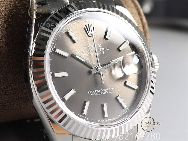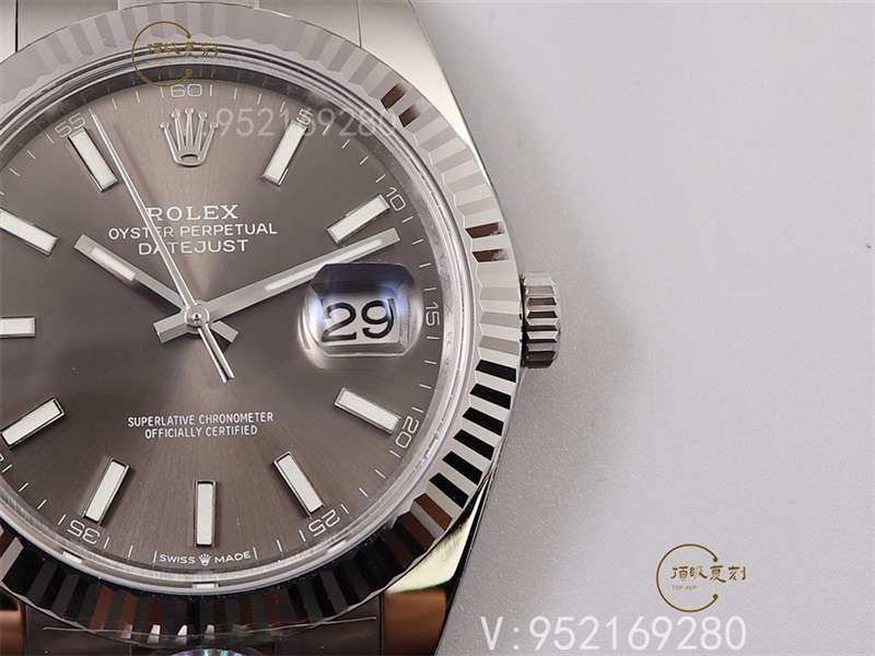 表盤:這款腕表的表盤我們一般稱之為灰色,其實是深銠白色表盤。勞力士表盤采用的太陽光線效果,是在同一金屬上達致純金屬色調(diào)的主要方法,譬如是銀灰、銠或釕。鍍銀主要用作太陽光線效果的底層,再在預(yù)制表盤上加入其他顏色。有時候,香檳色等色調(diào)需以六種以上的金屬進行電鍍。這里來看區(qū)別的話相對比較明顯,主要就是盤面放射紋路的密度以及盤面顏色,放射紋路的密度上復(fù)刻的我們可以看到密度比之正品要疏松一些所以看起來略有點菱角,這也是盤面看起來略顯得粗糙的唯一方面,顏色上雖然正品為銠白色在鍍金工藝上有區(qū)別,不過ar調(diào)色很出色,看不錯多大的區(qū)分。